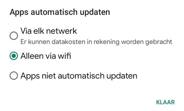 Ons advies is om de applicatie altijd automatisch up-to-date te houden via de Google Play Store, ongeacht of u een wifi- of dataverbinding gebruikt.